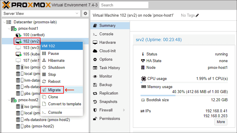Once you have a Proxmox cluster up and running, you can start migrating your VMs or containers when needed, as shown in the screenshot below: