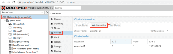 To join a node to the cluster, you need to copy some information from the first node where you created the cluster. To do that, navigate to Datacenter > Cluster and then click the Join Information button, as shown in the screenshot.