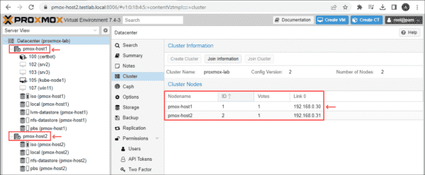 The second node will now be added to the Proxmox cluster. As soon as the node is added to the cluster, the server certificate is changed, so you need to reload the page and log in again to the Proxmox VE web interface. The screenshot below shows that our proxmox-lab cluster now has two nodes: pmox-host1 and pmox-host2.