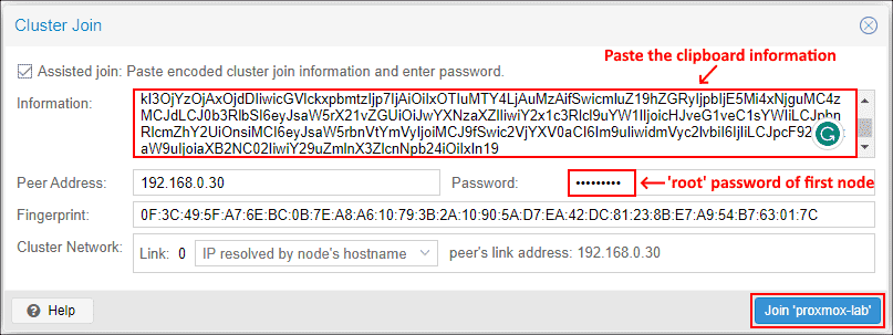 In the Information box, paste the join information, type the root password of the first node, and click the Join button.